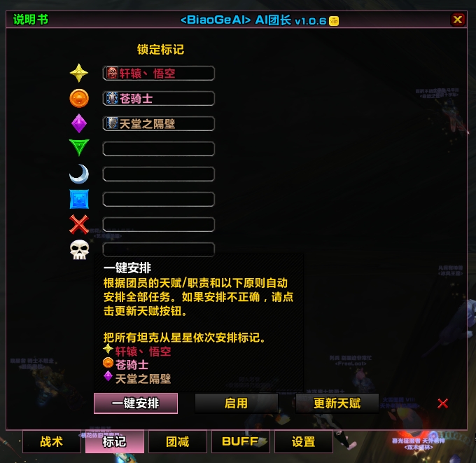 根据团员的天赋/职责,一键分配全部战术任务,并密语提醒到个人。