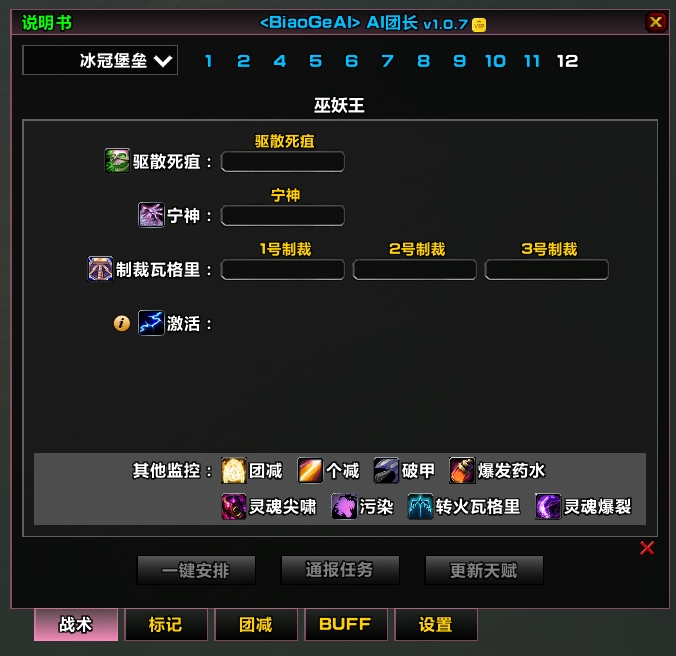 该插件是独立插件,无需依赖BiaoGe本体。 根据团员的天赋/职责,一键分配全部战术任务,并密语提醒到个人。 战后可以查看战斗分析,追踪责任人任务完成情况(任务名字会变绿)。 插件命令:/ai